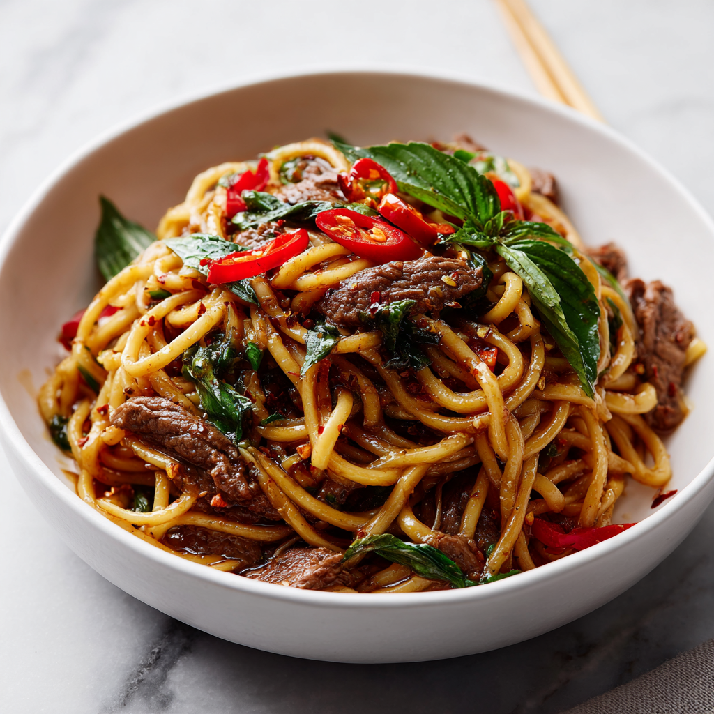 Thai cuisine is famous for its balance of flavors—salty, sweet, spicy, and umami. This recipe captures that perfect harmony. The beef is quickly stir-fried with garlic and chilies, then tossed with noodles and a flavorful sauce made from soy sauce, oyster sauce, and fish sauce. Fresh basil leaves are added at the end, releasing their aromatic oils and giving the dish its signature fragrance.