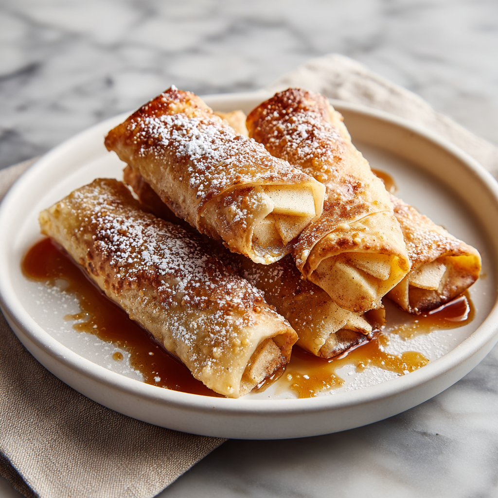 Crispy egg rolls filled with warm cinnamon-spiced apples, a fun twist on classic apple pie.