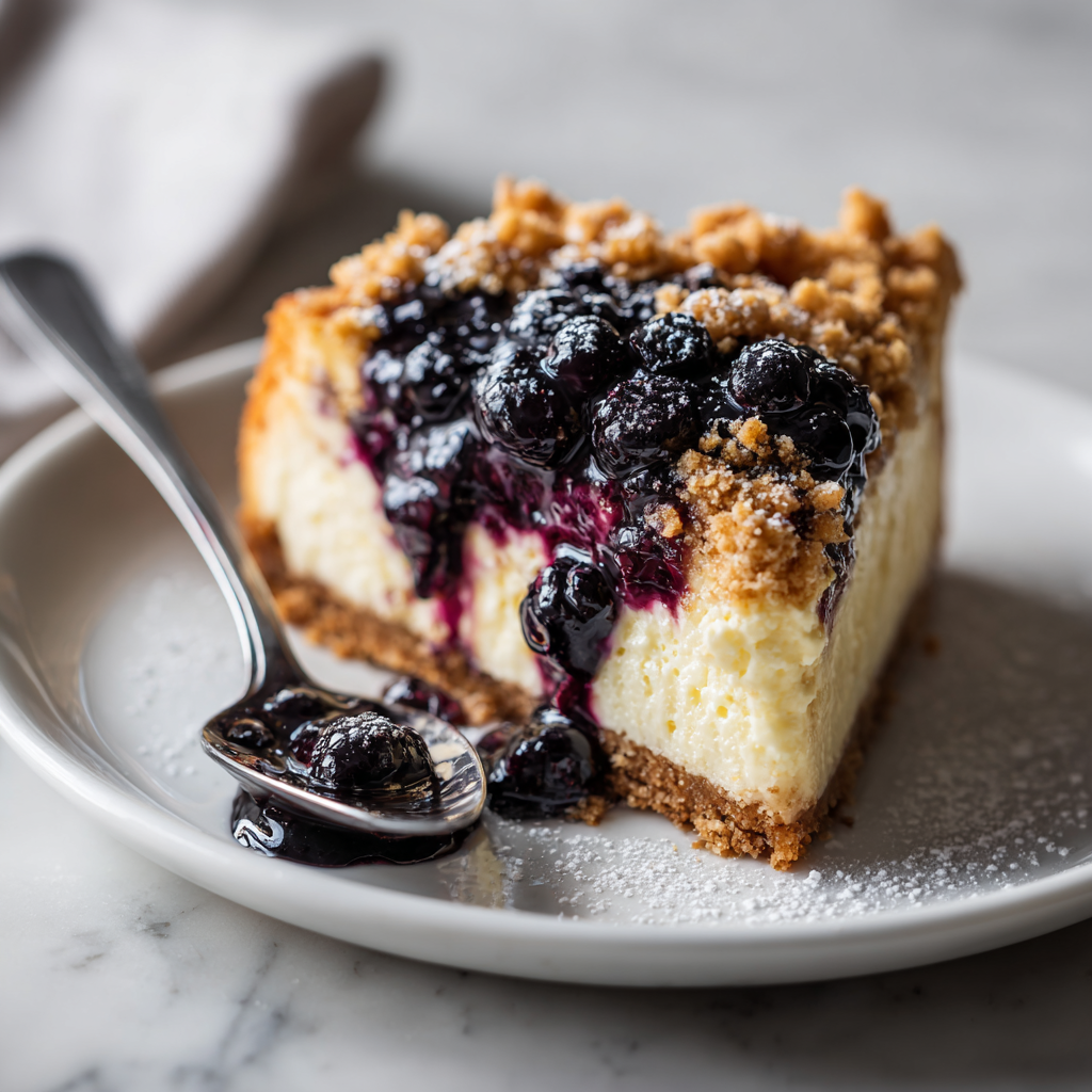 With its crunchy crumble topping, smooth cheesecake filling, and sweet blueberry swirl, this dessert is guaranteed to become a favorite in your recipe collection. Once you try it, you’ll want to make it again and again.