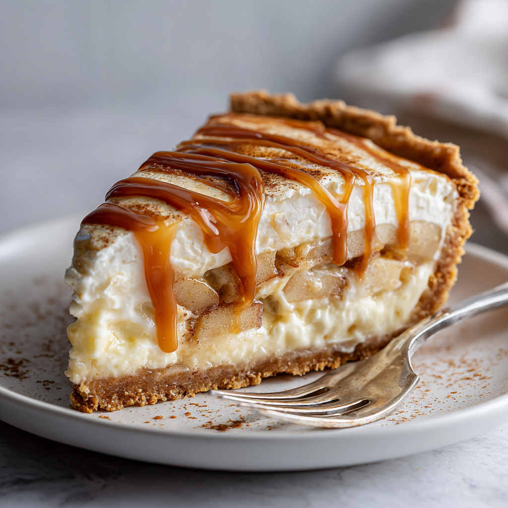 A delicious dessert combining creamy cheesecake, cinnamon apples, flaky pie crust, and rich caramel drizzle.