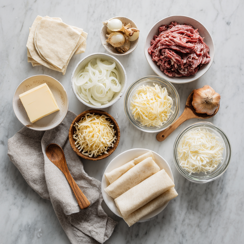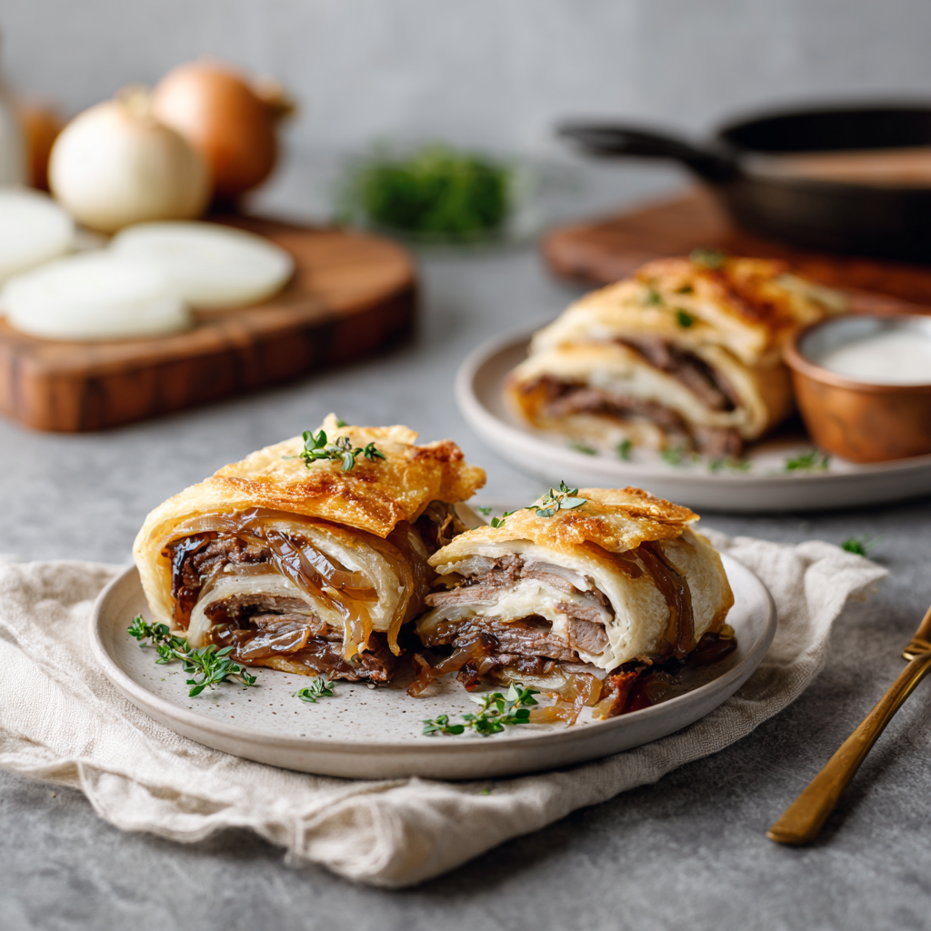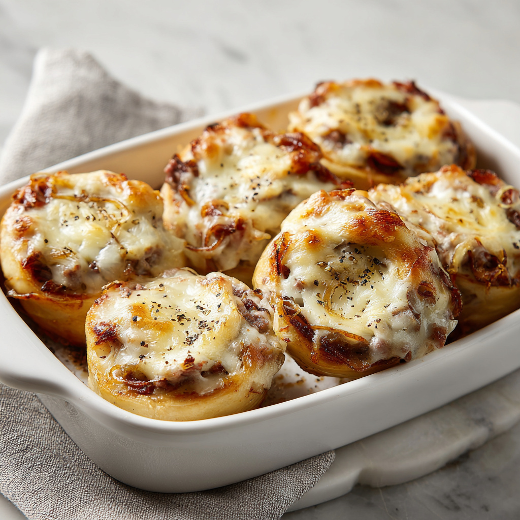 Savory roast beef rolls filled with sweet caramelized onions and melted cheese, baked to golden perfection.