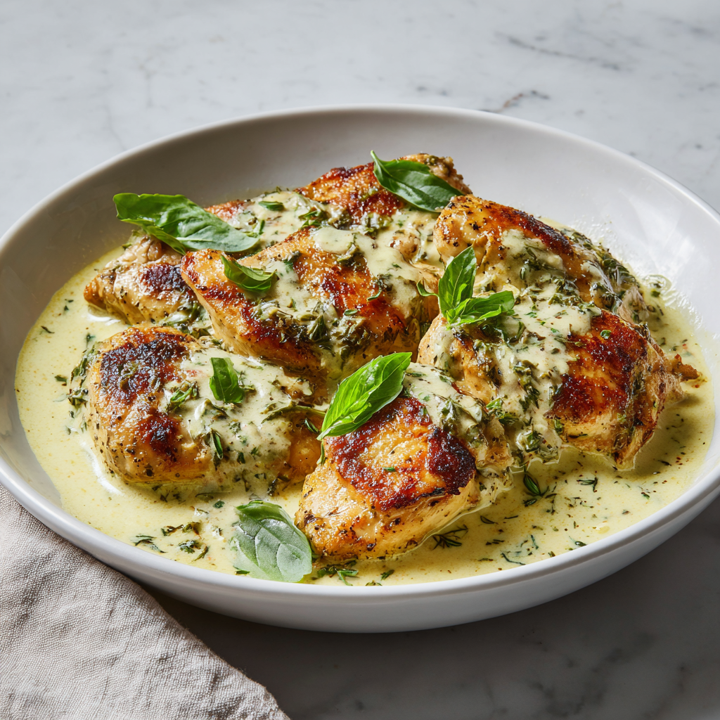 If you’re looking for a dish that feels both luxurious and comforting, this Chicken in Basil Cream Sauce is exactly what you need. With tender, golden-seared chicken nestled in a rich, velvety sauce infused with fresh basil and garlic, this recipe delivers restaurant-quality flavor right at home.