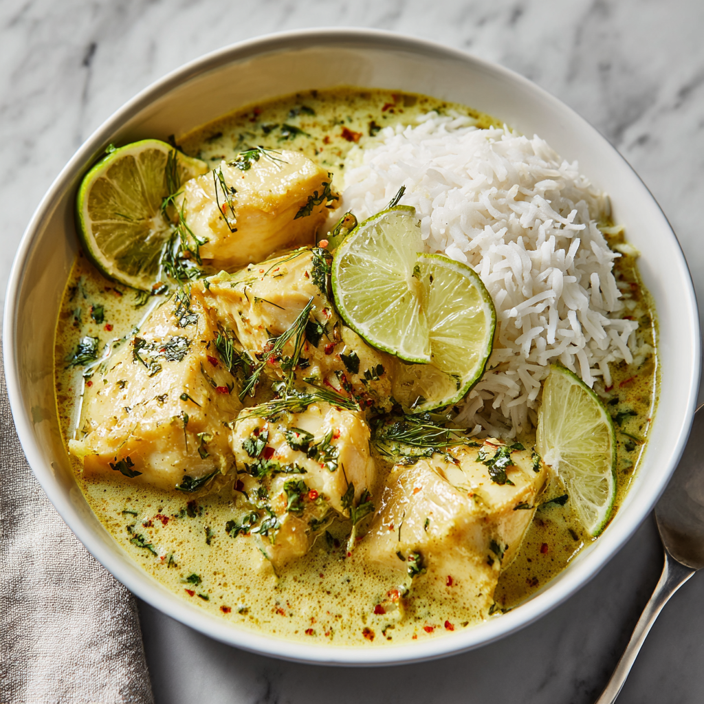 A creamy and zesty fish curry made with coconut milk and lime, served over fragrant jasmine rice.