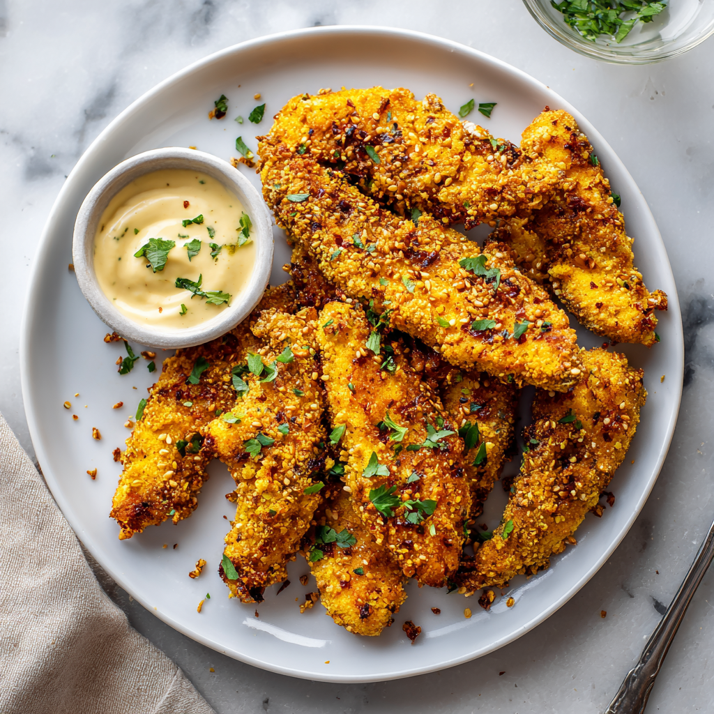 Golden oven-baked chicken tenders coated with turmeric and spices for a crispy, flavorful, gluten-free meal.