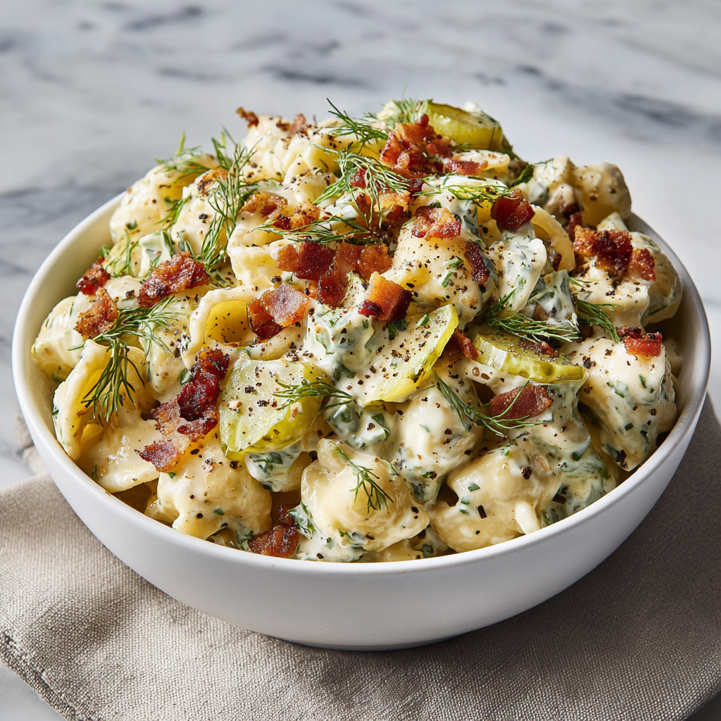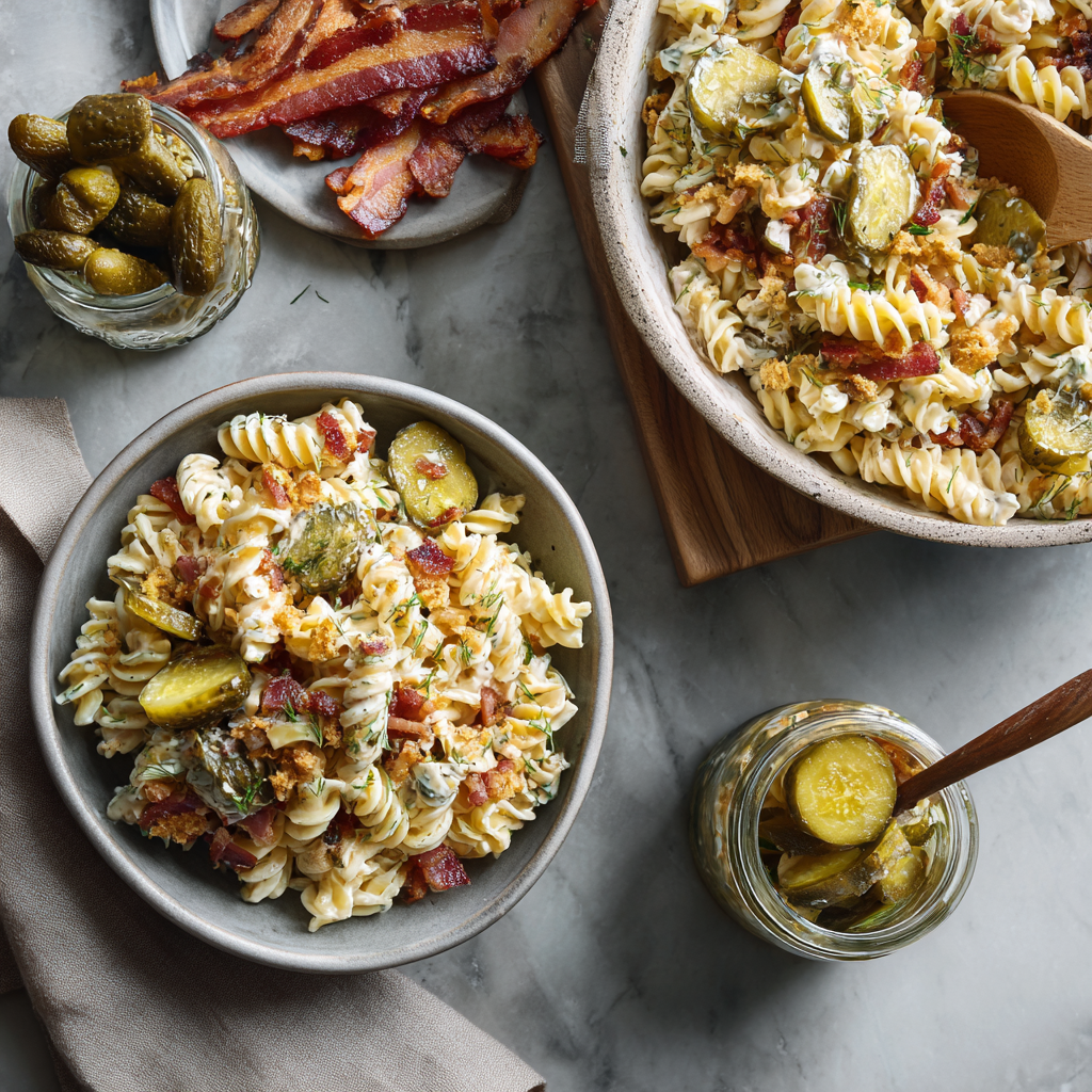 A creamy, tangy pasta salad loaded with crispy bacon and dill pickles for an irresistible side dish.