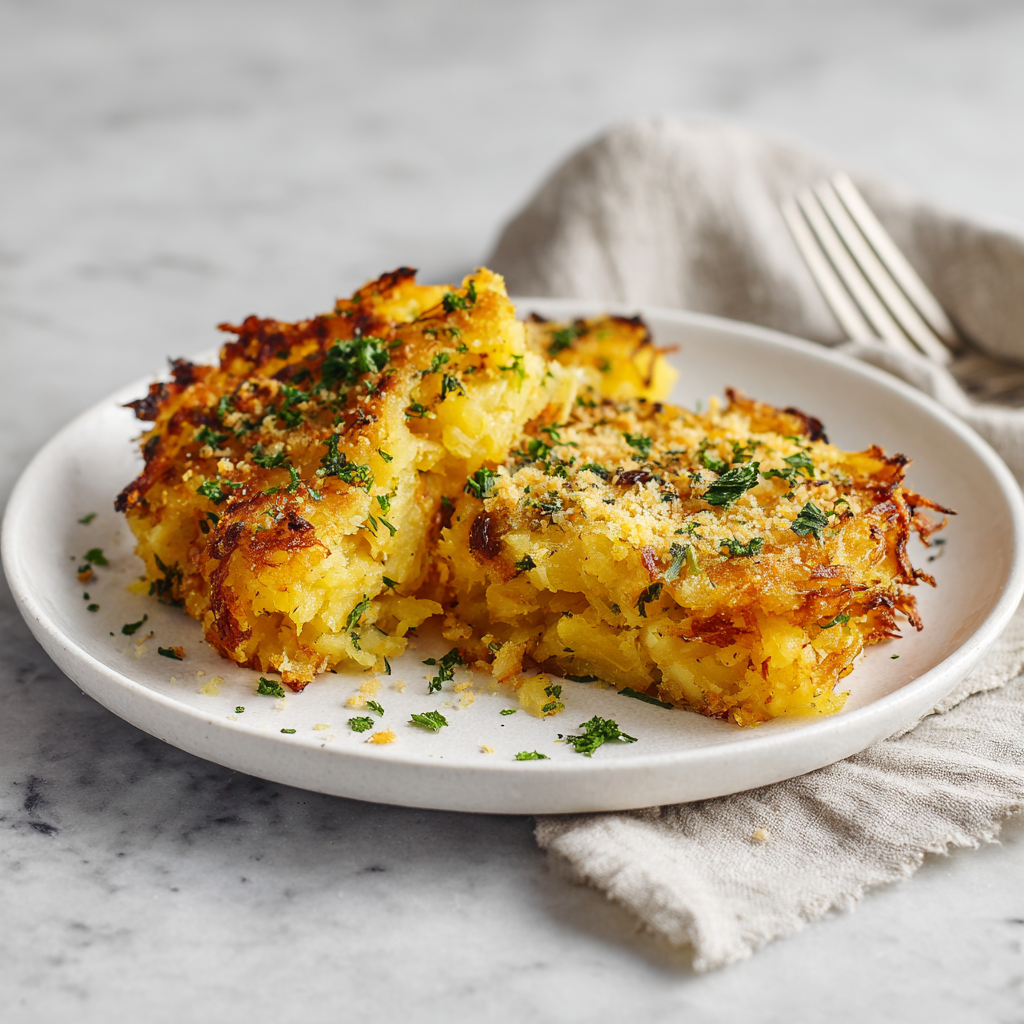 A traditional Slovenian dish made with crispy potatoes and melted cheese, forming a golden, savory hash.