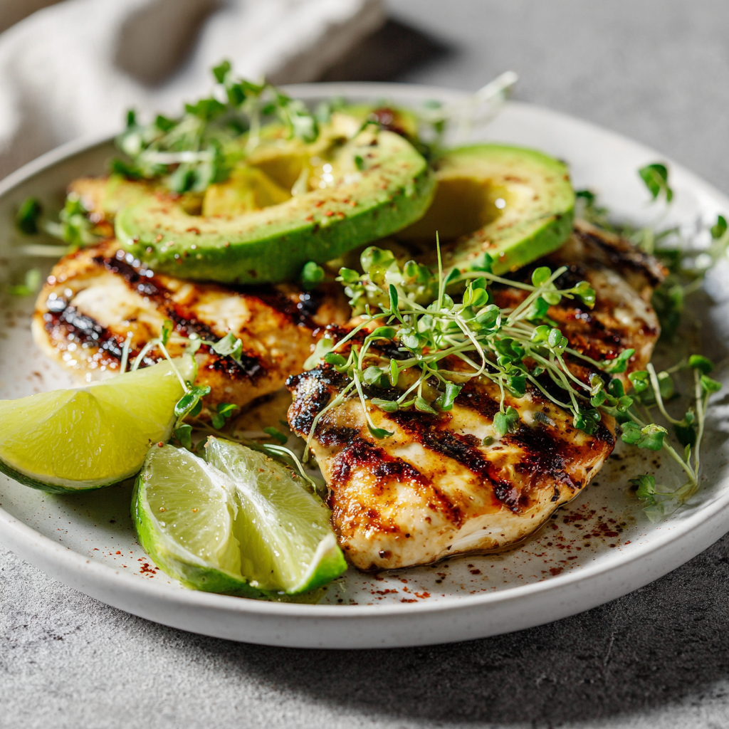 - Assemble the dish: Slice grilled chicken and arrange on a plate. Top with avocado slices and sprinkle with chopped cilantro. Optional: serve with lime wedges.