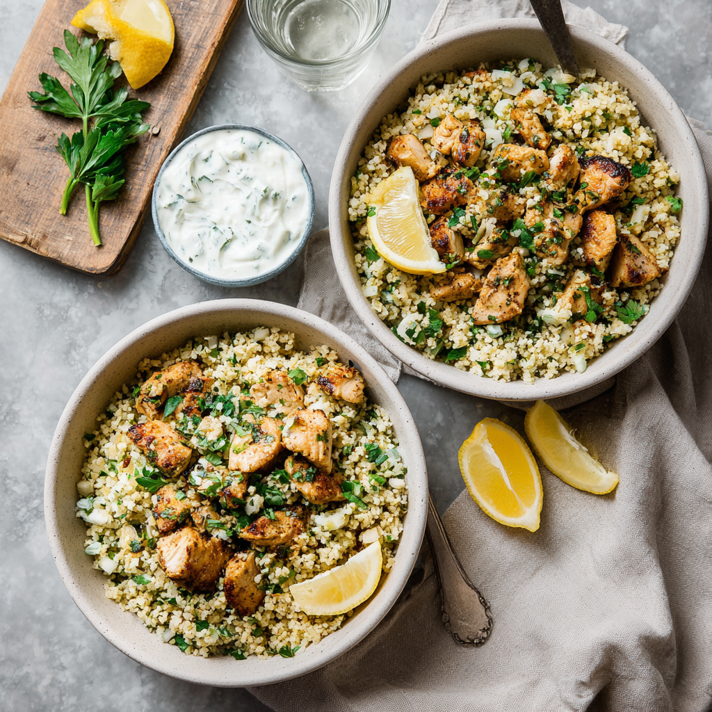The combination of savory chicken, light cauliflower rice, and bold Mediterranean ingredients creates a perfectly balanced dish. The lemon and herbs bring freshness, while olives and feta add depth and richness.