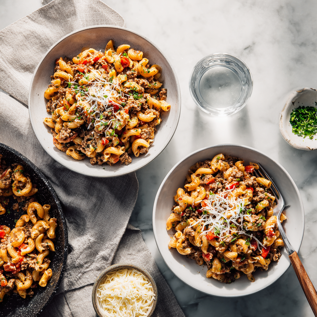 Perfect for busy weeknights, this dish combines tender pasta, seasoned ground beef, and a creamy tomato-based sauce finished with melted cheese. The result is a comforting, family-friendly meal that’s ready in about 30 minutes.
