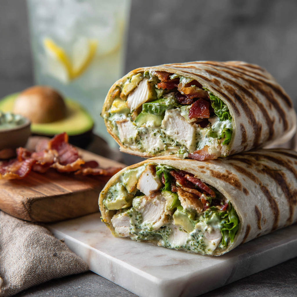 A fresh and flavorful wrap filled with pesto chicken, creamy avocado, crispy bacon, and crisp lettuce.