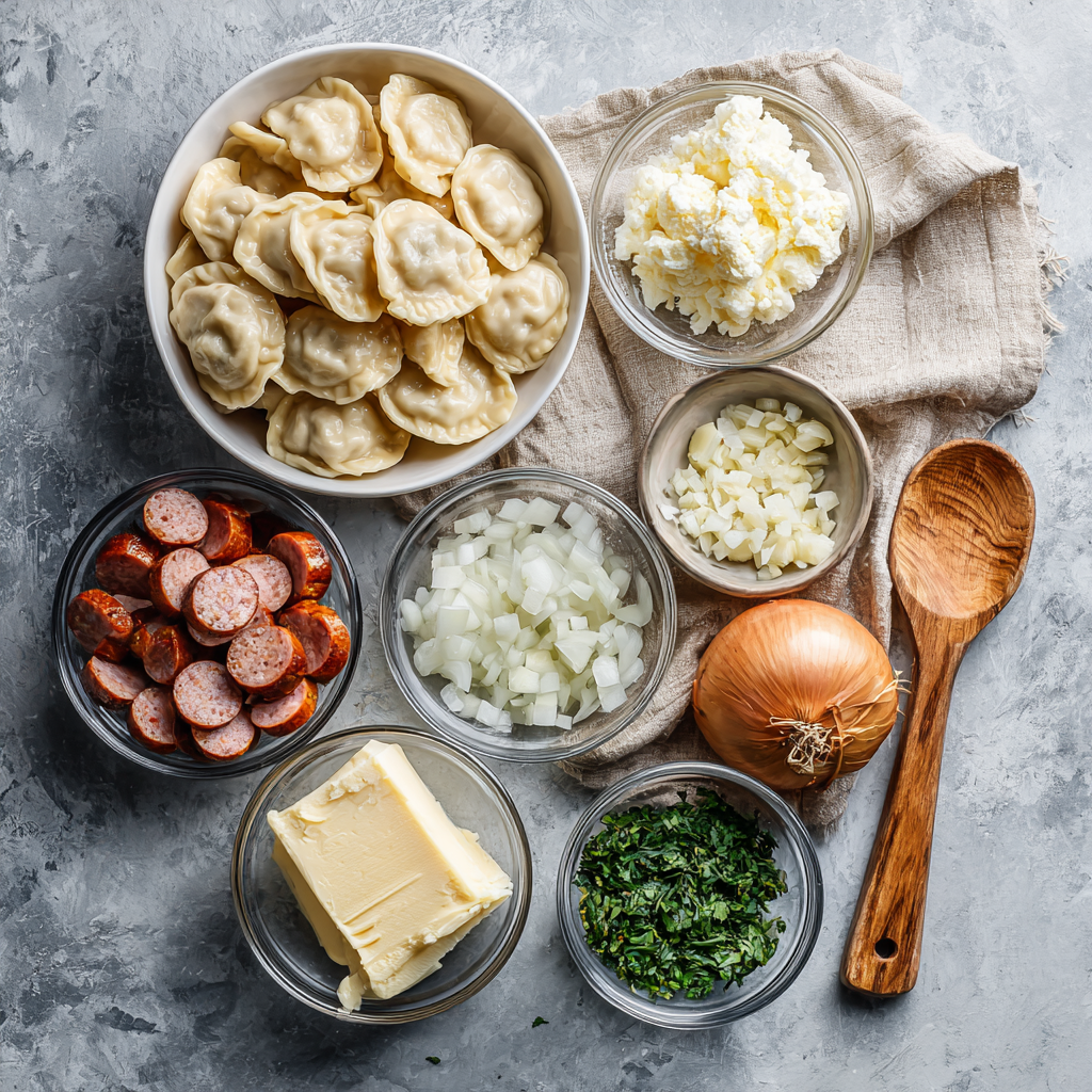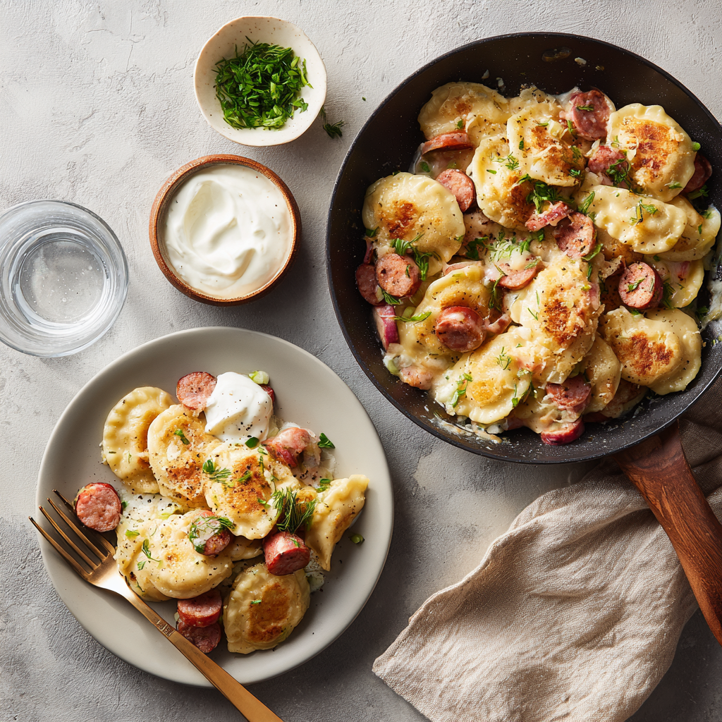 A quick and hearty one-pan meal with golden pierogies, smoky kielbasa, and caramelized onions.