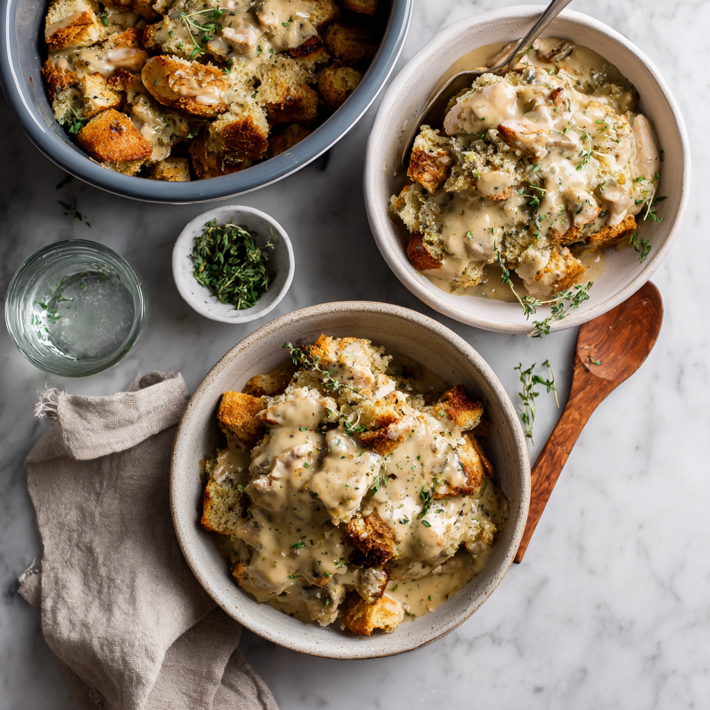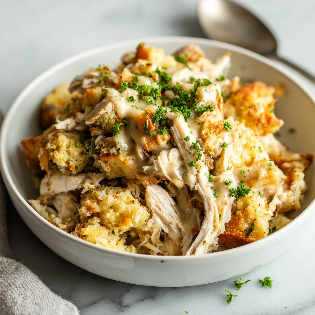 The combination of chicken, stuffing, and creamy sauce creates the ultimate comfort dish.
