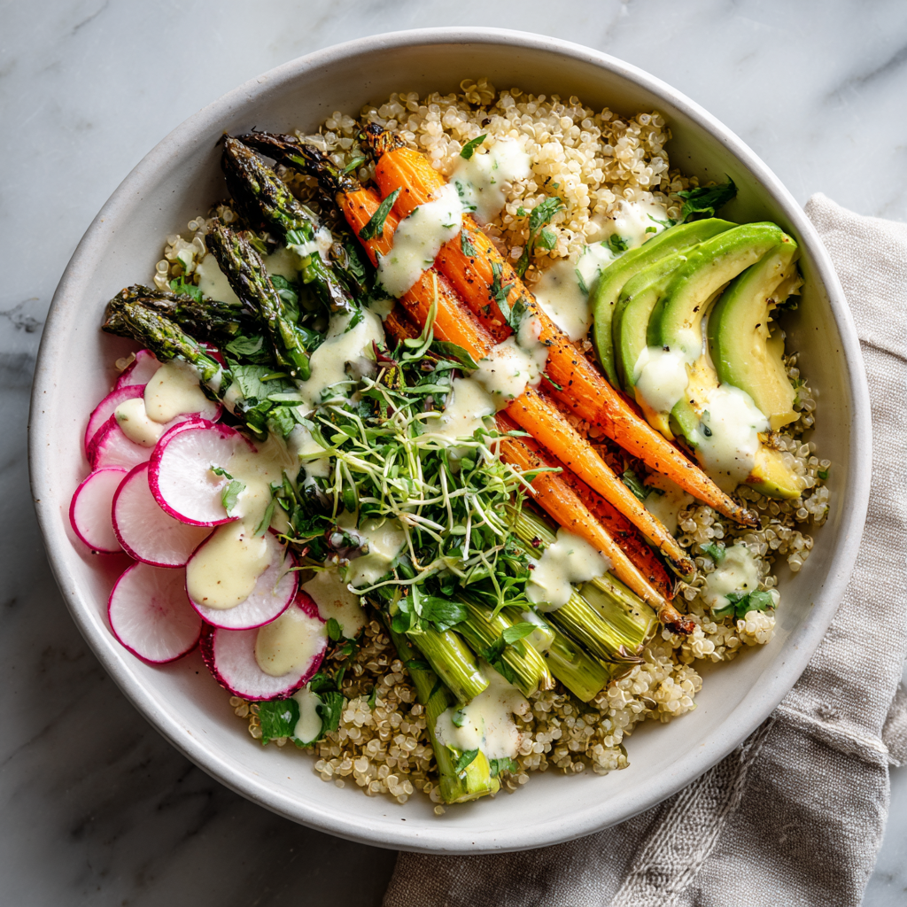 Quinoa bowls have become increasingly popular in modern healthy cooking because they are versatile, satisfying, and easy to customize. In this recipe, fluffy quinoa serves as the wholesome base, topped with crisp spring vegetables, creamy avocado, and a bright lemon tahini dressing that ties everything together.
