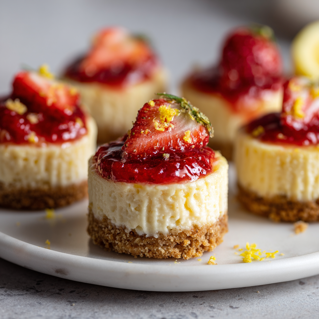 Creamy mini cheesecakes with a lemon filling and sweet strawberry topping.