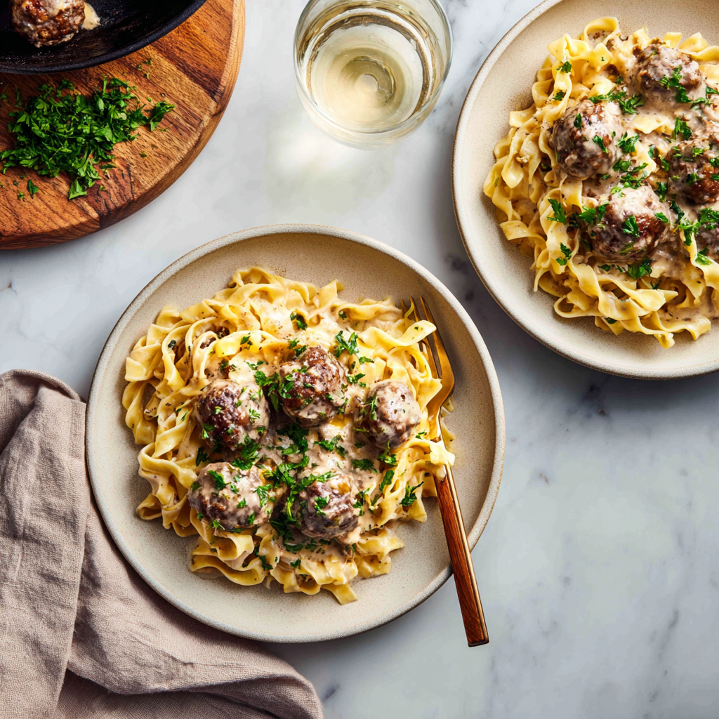 Creamy Swedish meatballs served over pasta in a rich, comforting sauce.